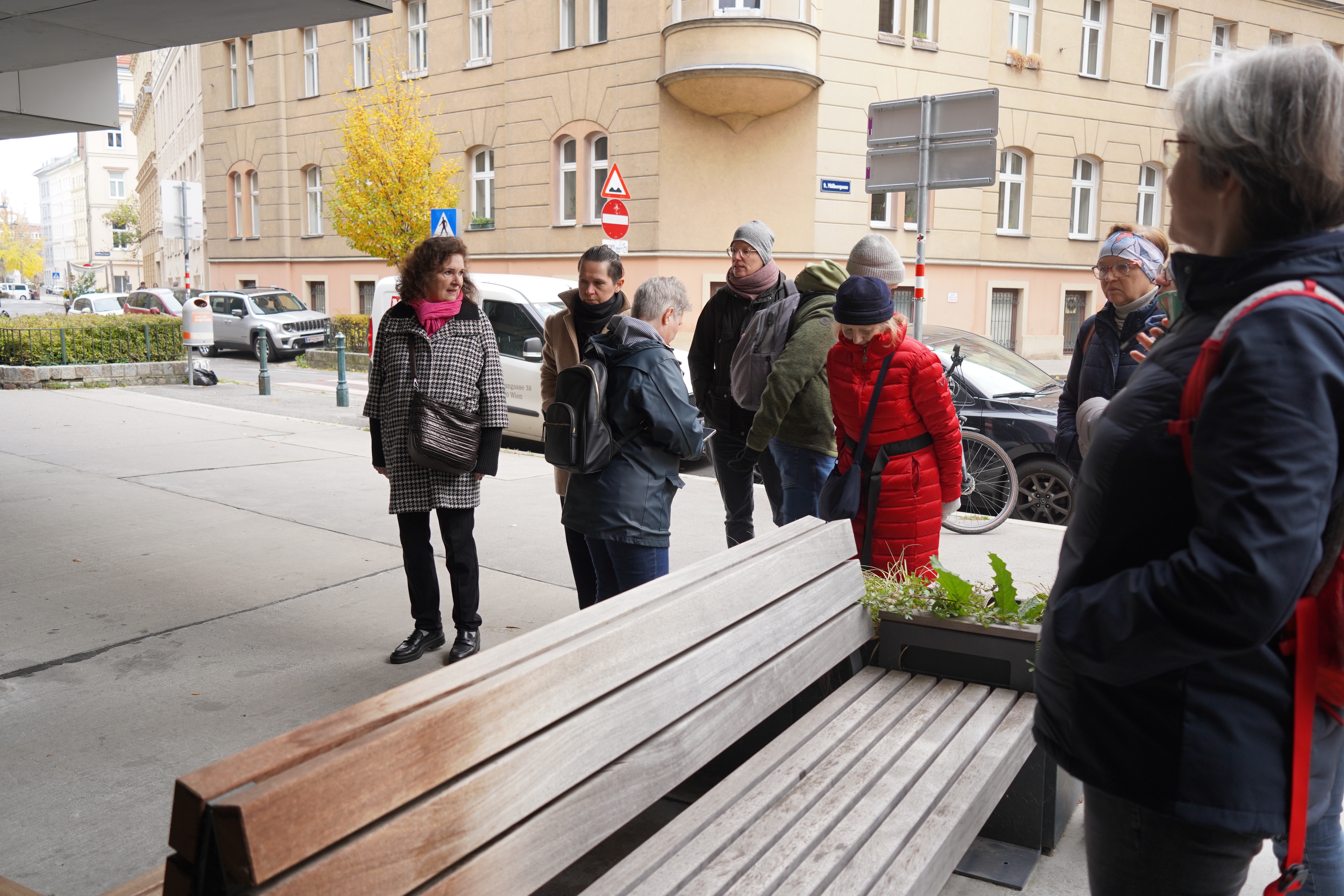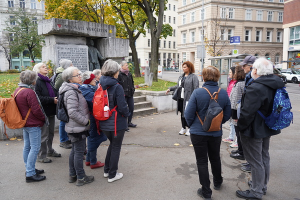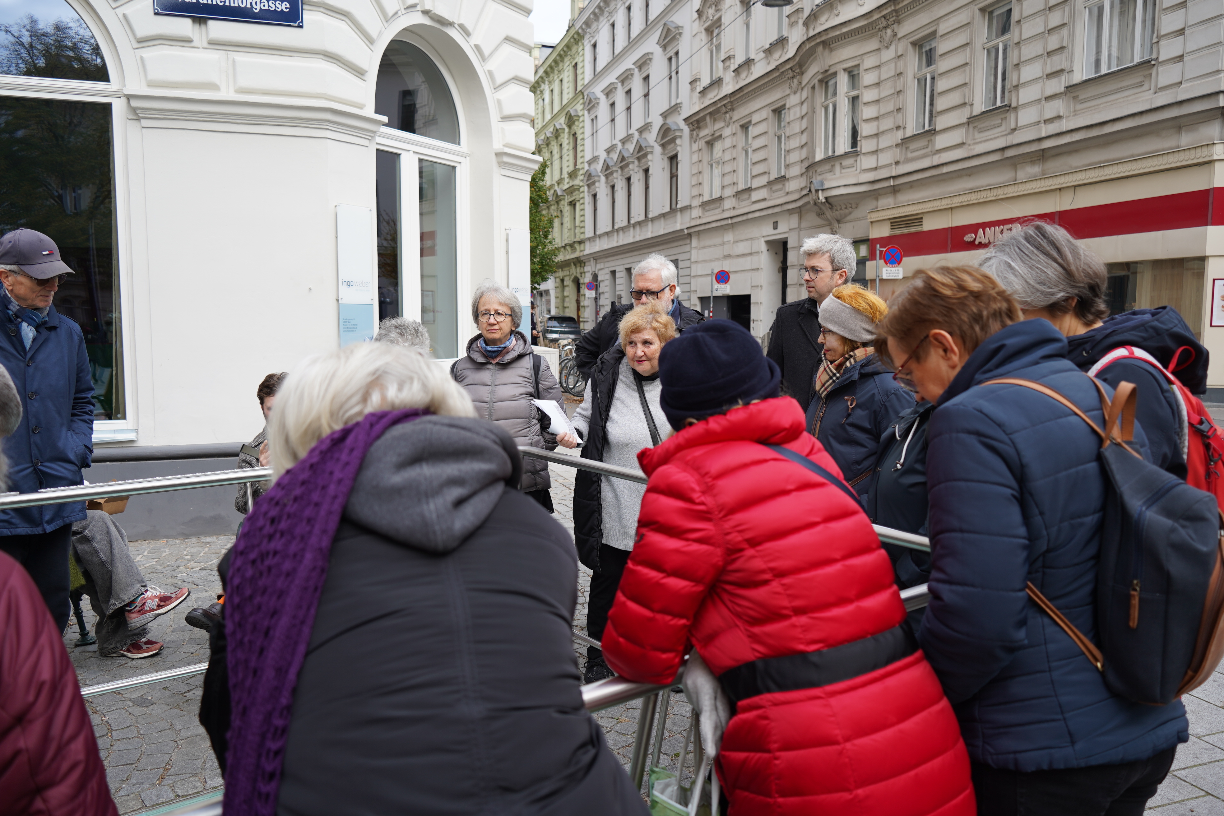 Im Servitenviertel trafen wir die ehemalige Bezirksvorsteherin des 9. Bezirks, Martina Malyar. Sie führte uns von der Gedenktafel bei der Servitengasse 6 über das Denkmal „Schlüssel gegen das Vergessen“ bei der Servitengasse 11 bis hin zum ehemaligen Lehrlingsheim und Waisenhaus in der Grünentorgasse 26, bei dem sie auch eine sehr persönliche Familiengeschichte erzählte.