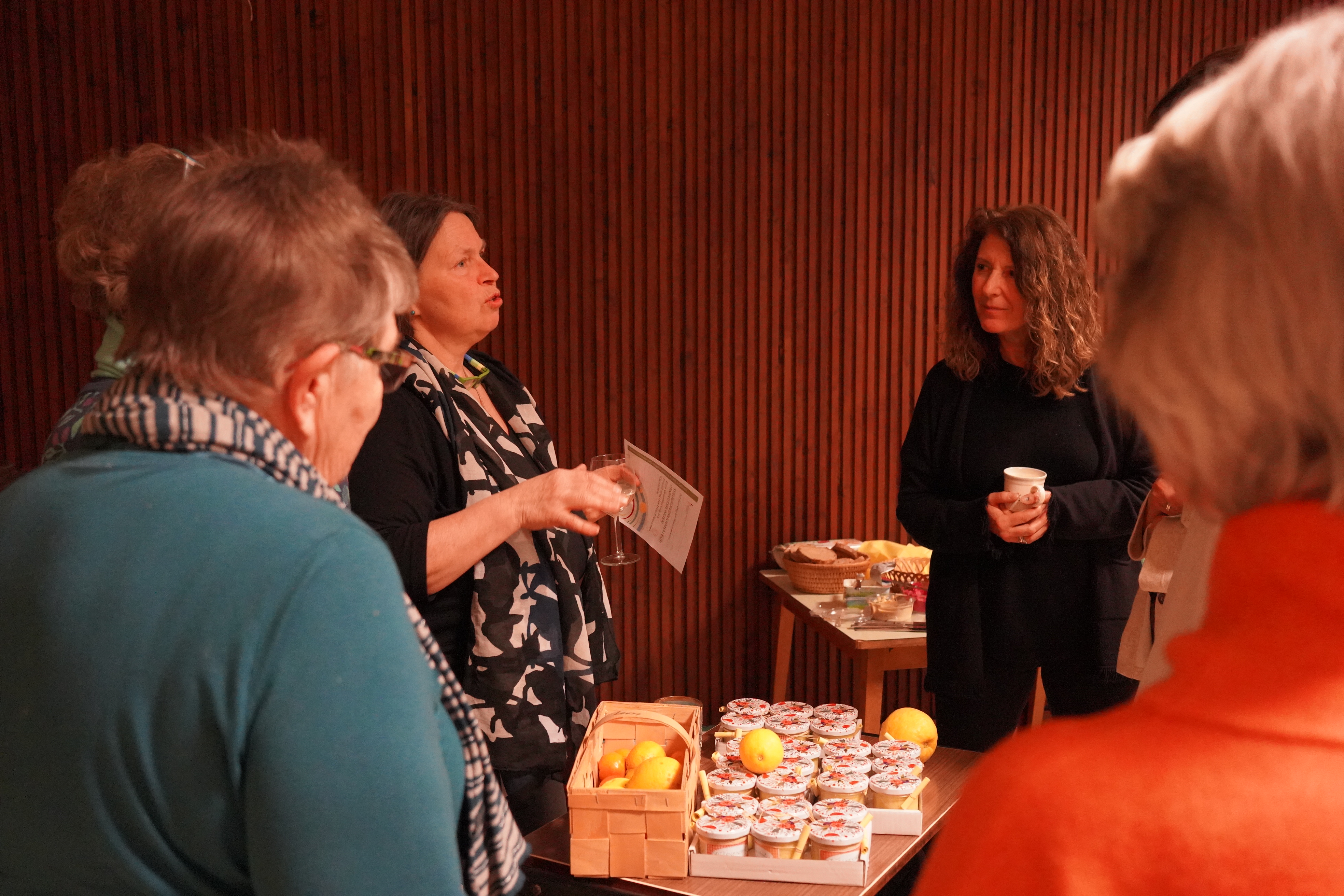 Nach einer kleinen Pause zur Stärkung bauten wir einen Mini-Marktplatz mit "Good Practise Beispielen" auf. Wir hörten vom Projekt "Energy with Spirit", das einen Beitrag leistet, um die Herausforderungen der Energiekrise zu bewältigen, indem vulnerable Bevölkerungsgruppen in die Energiewende einbezogen werden (Stichwort: Solidarische Energiegemeinschaften). Verkostet werden konnten Zitrusfrüchte, die bei einer Kleinbauernfamilie in Sizilien in großer Menge zu fairen Preisen gekauft und unter Gemeindemitgliedern in Wien Neubau verteilt werden. So können die Kosten für den Transport aufgeteilt werden und die Konsument:innen wissen genau, wo ihre Zitronen herkommen. Abgesehen davon ist die Qualität ganz anders als bei im Supermarkt gekauften Früchten. Außerdem erfuhren wir, dass sich alte Jeans hervorragend zur Herstellung von Dämmstoff eignen (mehr Infos hier).